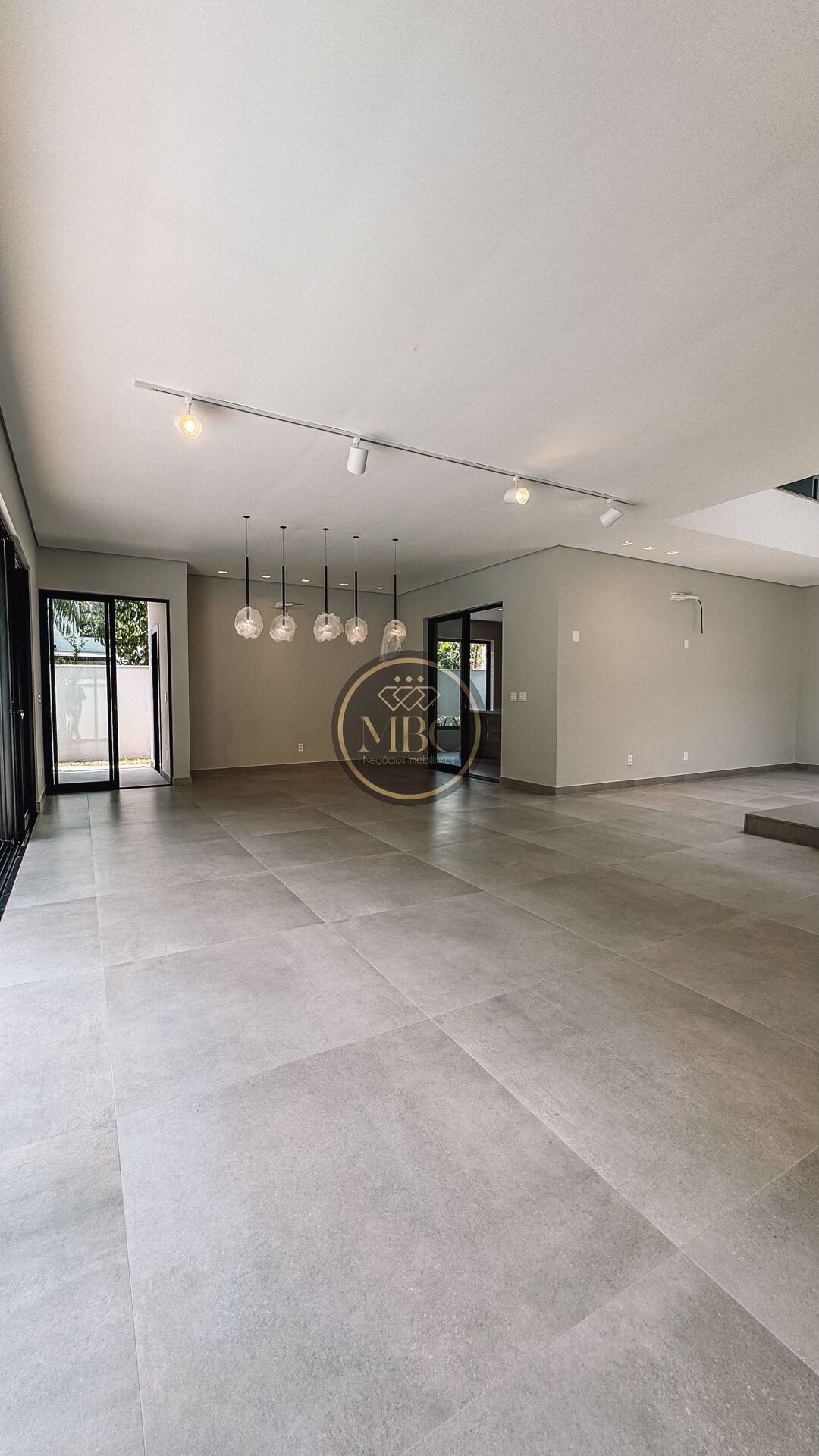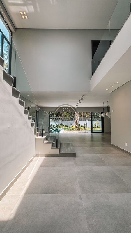 Escada com guarda corpo em vidro e janelões em vidro.