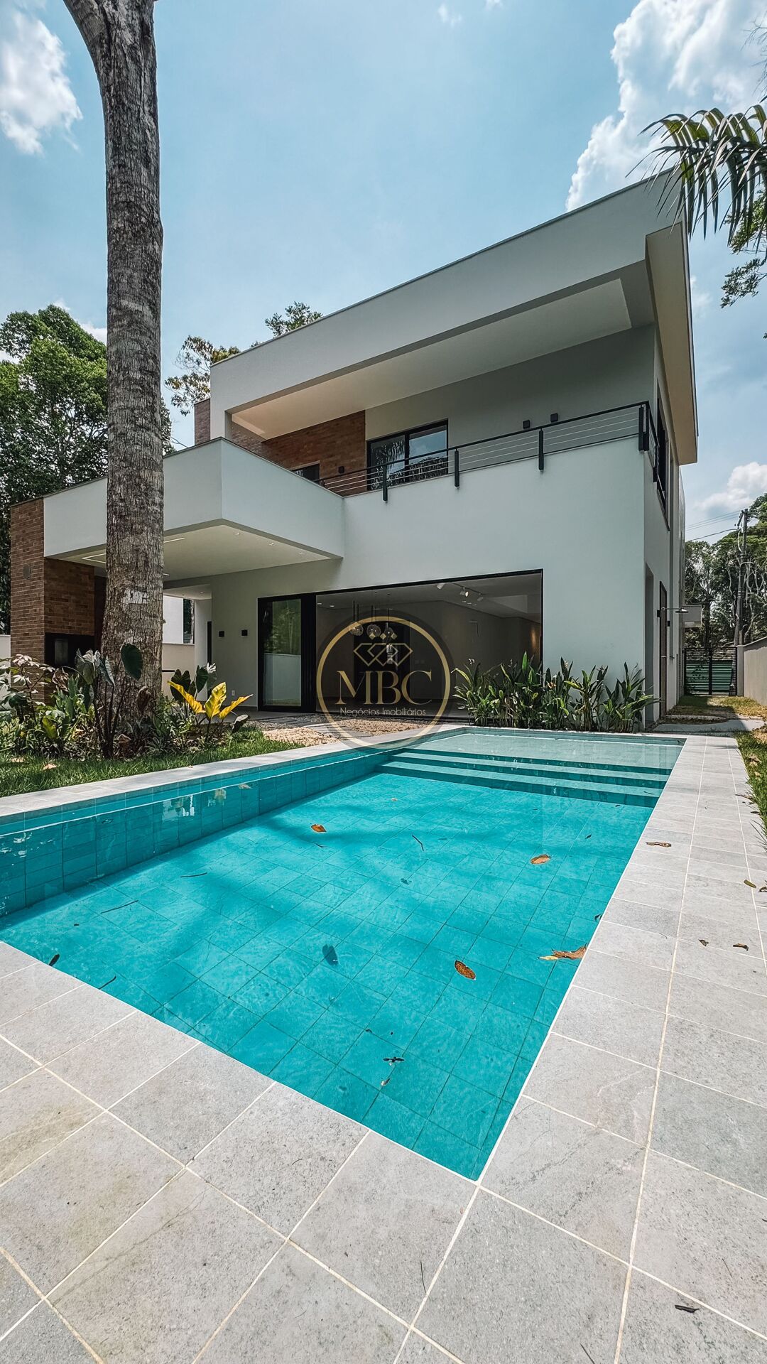 Piscina com churrasqueira e lavabo externo, separados por portas de vidro tipo cortina;