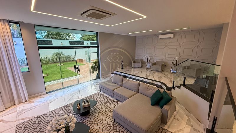 Casa térrea com 5 suítes (1 master com closet) + 1 suíte para hóspedes, sala ampla com 3 ambientes, sala de estudos, copa-cozinha completa, lavanderia e dependência de empregada.